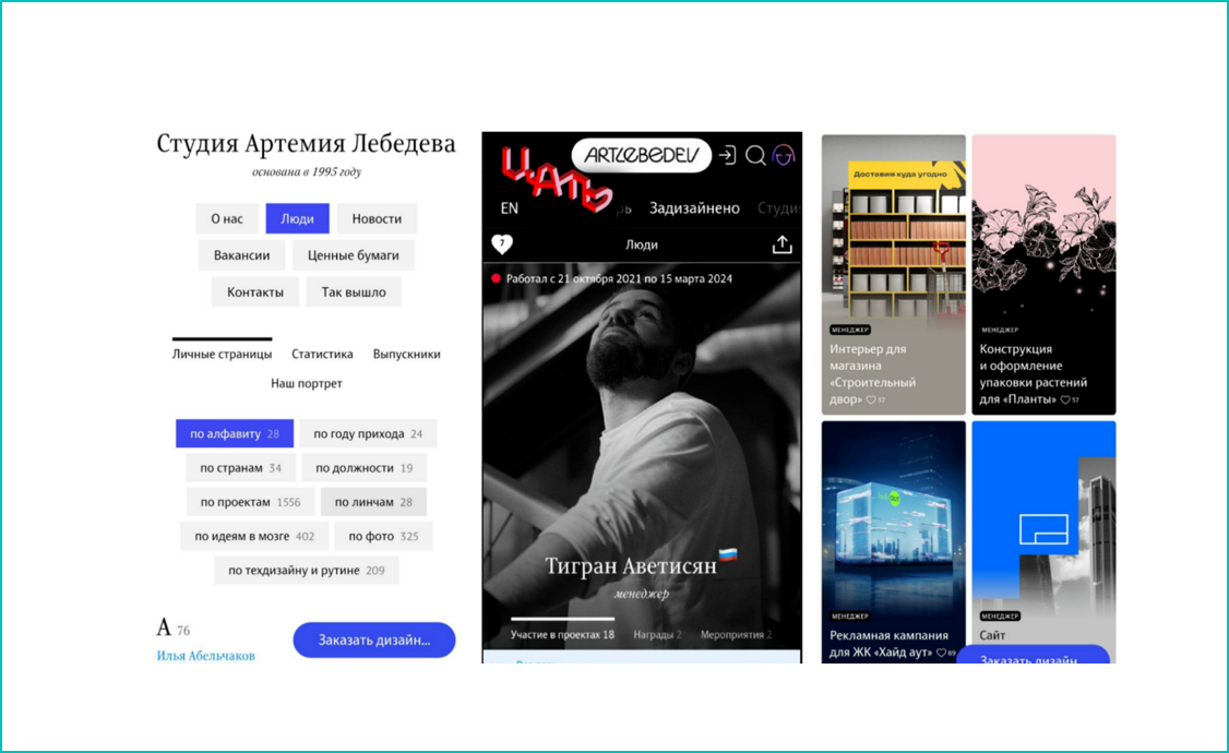 На сайте есть список всех сотрудников, которые работают или работали в компании. Можно посмотреть каждого, в каких проектах принимал участие и что сделал