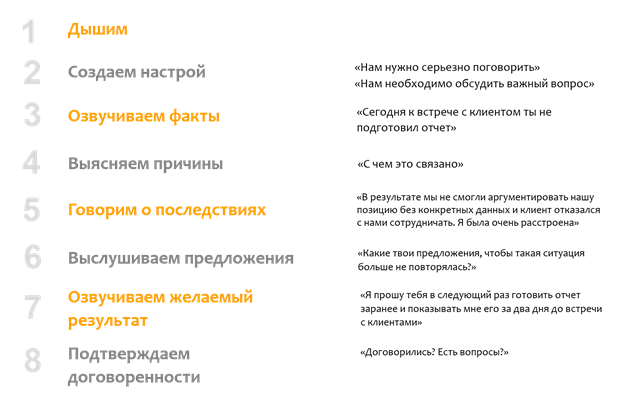 Ниже мы разберем с вами 8 шагов. Этот алгоритм работы с сотрудником можно дать руководителям в качестве небольшой подсказки, а также включить в обучение
